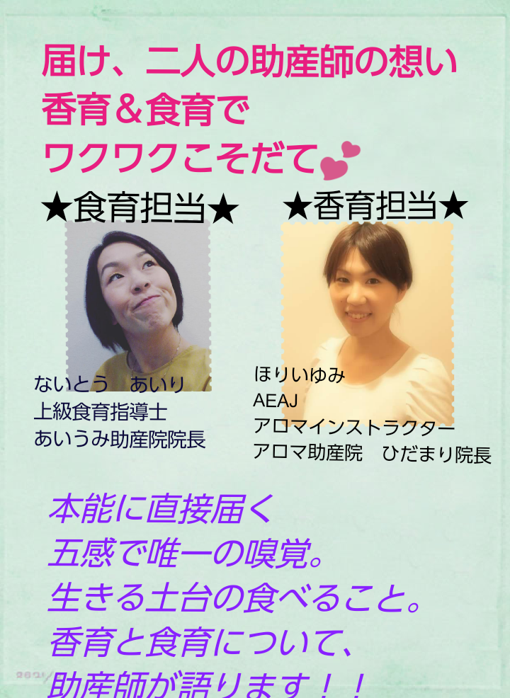 みなさん、こんばんは。あいうみ助産院のないとうあいりです。今度の土曜日、21日。安城のアンフォーレでイベントやるんです。10時~。私と、助産学校時代の同期のほりいゆみさんとの二人でのイベント。私は食育担当でお話。ゆみはアロマインストラクター... -